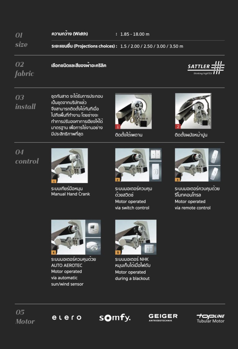 เตรียมการผลิตโครงสร้างพร้อมทั้งผ้า และระบบขับเคลื่อนก่อนนำไปติดตั้งจริง ณ สถานที่ โดยทีมช่างผู้ชำนาญการ มีประสบการณ์เฉพาะทางด้านการติดตั้งกันสาด และโครงสร้างผ้าใบได้อย่างสวยงามและปลอดภัย